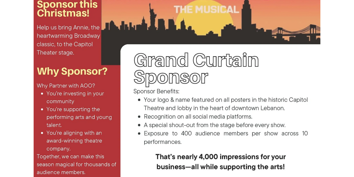 All of our productions are held at the historic Capitol Theatre in Lebanon, TN- a top tier venue in the greater Nashville area, boasting an ideal location for a flourishing arts community-a community that we would love to have your organization be a part of in 2025 Season.